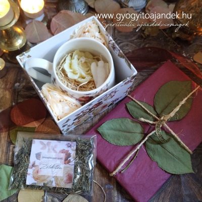 • Ajándékcsomag tealevél jósláshoz - Rózsás fehér bögrével