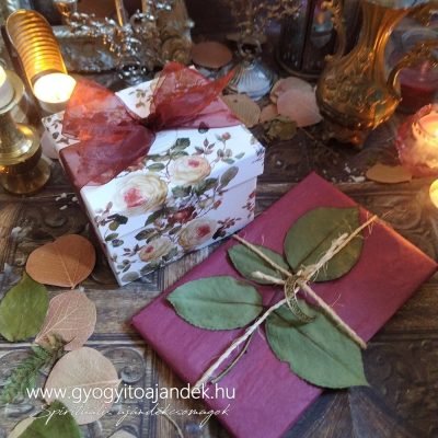 - A tealevél jóslás című könyv gyönyörűen becsomagolva, fém Hold medállal és préselt levelekkel díszítve