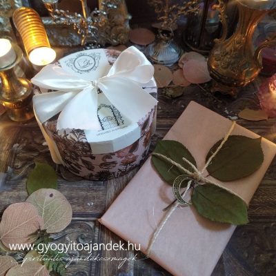 - A tealevél jóslás című könyv gyönyörűen becsomagolva, fém Hold medállal és préselt levelekkel díszítve