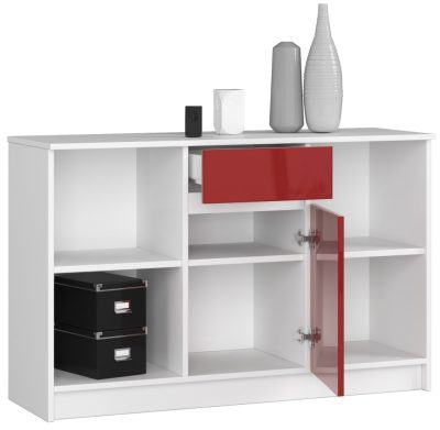 Modern B-17 komód 120 cm szélességgel, fehér-piros magasfényű kivitelben. Praktikus tárolási megoldás 6 polccal, fiókkal és ajtóval. Minőségi laminált bútorlap.