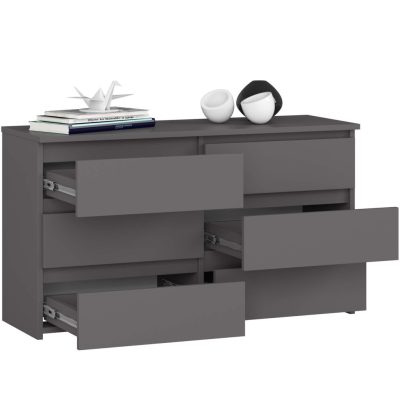 Modern, 6 fiókos komód laminált bútorlapból, amely tökéletes tárolási megoldást kínál. A matt szürke kivitel és az ABS élzárás elegáns megjelenést és tartósságot biztosít.