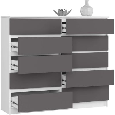 Modern, 10-fiókos komód fehér-szürke színben, kopásálló laminált lapból. Nagy tárolókapacitás, fém görgős fióksínek, ABS élzárás. Méret: 138x121x40 cm.