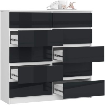 Ez a 120 cm széles komód tökéletes kombinációja a stílusnak és funkcionalitásnak. A magasfényű grafit frontok és a matt fehér korpusz kontrasztja modern megjelenést kölcsönöz a bútornak. A 10 tágas fiók bőséges tárolóhelyet biztosít ruháknak, kiegészítőknek vagy irodai kellékeknek.