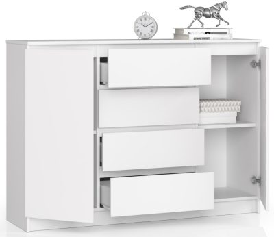 Modern, fehér komód 4 fiókkal és 2 ajtóval, amely tökéletes tárolási megoldást kínál. A 16 mm-es kopásálló laminált lapból készült bútor elegáns megjelenést és tartósságot biztosít otthonában.