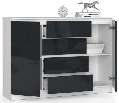 Modern, tágas komód fehér korpusszal és magasfényű grafit frontokkal, 4 fiókkal és 2 ajtóval. Tökéletes tárolási megoldás a nappali, étkező vagy hálószoba számára.