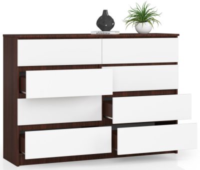 Modern, 8 fiókos komód wenge-fehér színben, 16 mm-es laminált lapból. Ideális tárolási megoldás nappaliba vagy hálószobába. Méretei: 138x99x40 cm.