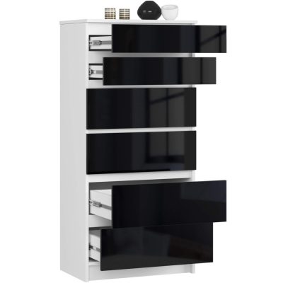Modern, 6 fiókos komód magasfényű fekete frontokkal és fehér korpusszal. Kiváló minőségű, kopásálló laminált lapból készült, ABS élzárással a tartósság érdekében.