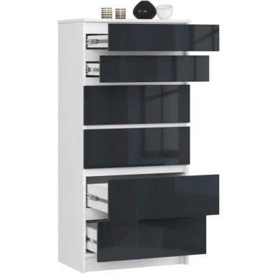 Modern, 6 fiókos komód fehér korpusszal és magasfényű grafitszürke frontokkal. A 60 cm széles bútor kiváló tárolási megoldást kínál különböző méretű fiókjaival, kopásálló laminált lapból készült kivitelezésbe