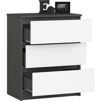 Modern, kompakt komód három fiókkal, amely tökéletes tárolási megoldást kínál. A grafitszürke test és fehér matt frontok elegáns kontrasztot alkotnak, míg a kiváló minőségű laminált lap és ABS élzárás tartóss
