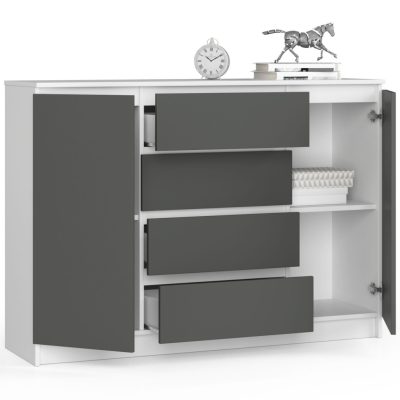 Modern, tágas komód 4 fiókkal és 2 ajtóval, amely tökéletes tárolási megoldást kínál. A fehér korpusz és szürke matt frontok elegáns kombinációja minden enteriőrbe harmonikusan illeszkedik.