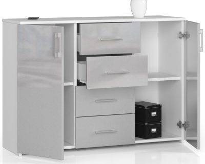 Elegáns, modern komód fehér korpusszal és metál magasfényű frontokkal, 4 fiókkal és 2 ajtóval a maximális tárolási kapacitásért.