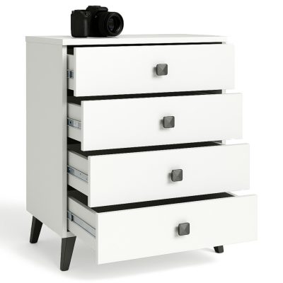 Modern, kompakt komód 4 tágas fiókkal, amely tökéletes tárolási megoldást kínál bármely helyiségbe. A fehér-fekete színkombináció és a minőségi laminált lapok elegáns megjelenést biztosítanak.