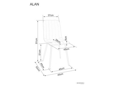 Az Alan étkezőszék a modern design és a kényelem tökéletes ötvözete. A szék olívazöld bársony kárpitozása puha és kellemes tapintású, míg a fekete matt fémváz stabil alapot biztosít. A szék háttámlája függőleges bordázattal rendelkezik, ami nem csak esztétikus, de ergonomikus kialakítást is eredményez. A karcsú, 45 cm széles ülőfelület ideális méretű az étkezőasztal mellé.