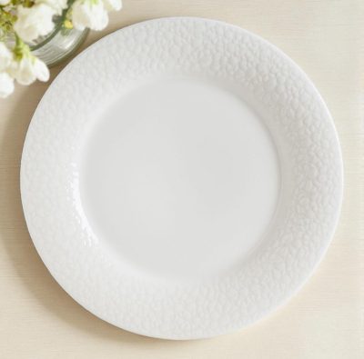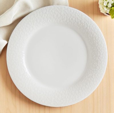 Az enyhe krém szín és a perem mentén futó finom kráteres díszítés harmonikus, meleg tónust ad az asztalnak. Ez a fajta porcelán a séfek kedvence, mert nem versenyez az étellel – csak kiemeli azt.