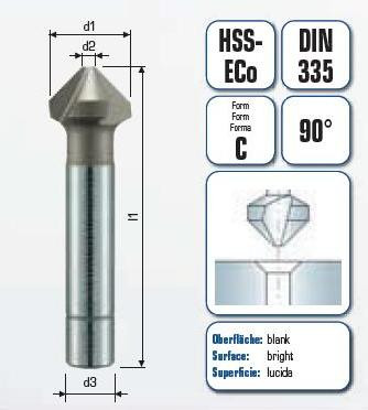 Háromélű 90°-os kúpsüllyesztő gyorsacélból 5% cobalt tartalommal, hengeres szárral.