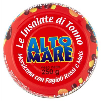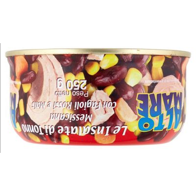 Alto Mare mexikói tonhal saláta, 250g, Összetevők: tonhal (27%), vörösbab (23%), kukorica (14%), napraforgóolaj, zöldségek változó arányban (sárgarépa, pirospaprika), só, természetes csípős paprika aroma, természetes édes paprika aroma. Átlagos tápérték 100g termékben: Energia: 830 kJ / 200 kcal, zsír: 15 g, ebből telített zsírsavak: 1.6 g, szénhidrát: 6.8 g, ebből cukrok: 2.7 g, fehérje: 9.4 g, Só: 0.55 g. Minőségét megőrzi a csomagoláson feltüntetett időpontig. Hűvös, száraz, helyen tartandó. Származási ország: Olaszország. Forgalmazó: Milis Faplusz Kft., 8092 Pátka, Gárdonyi u. 36.