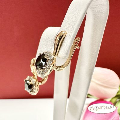 Antiallergén, nikkel és ólom mentes fülbevaló, arany színű, fekete kristállyal díszítve.