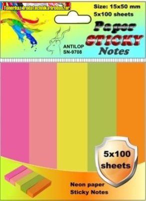 Antilop SN-9708 papír, öntapadós, visszaszedhető jelölő címke, könyvek, dokumentumok oldalainak megjelölésére. Egy tömb tartalma: 100 lap neon piros, 100 lap neon rózsa, 100 lap neon sárga,