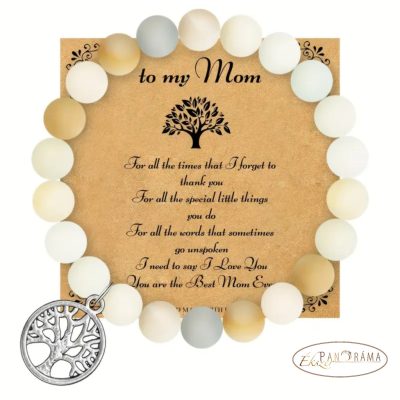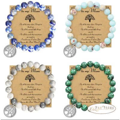 Ásványkő sztreccs karkötő Amazonit kövekkel, lógó életfa medállal, Anyák napi kártyával