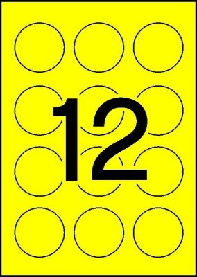 • APLI No. 02866 neon sárga színű 60 mm átmérőjű, lézernyomtatóval nyomtatható, öntapadós etikett címke, permanens ragasztóval A4-es íven - kiszerelés: 240 címke / 20 ív (LCA2866)