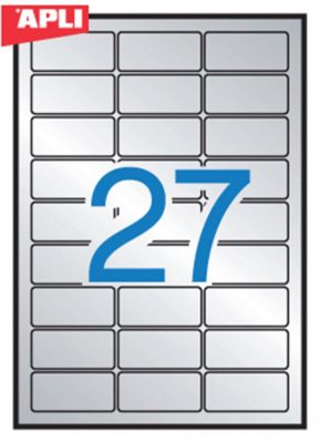• APLI No. 10070 ezüst színű 63,5 x 29,6 mm méretű, lézernyomtatóval nyomtatható, öntapadós ipari etikett címke, erős, tartós ragasztóval A4-es íven - kiszerelés: 540 címke / 20 ív (LCA10070)