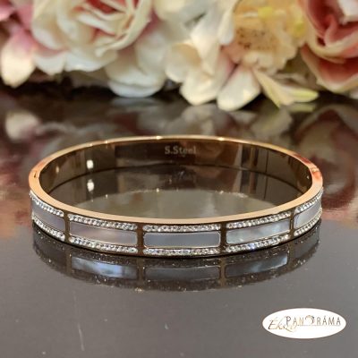 Nemesacél aranyozott nyitható karperec kagylóhéj és kristály díszítéssel.