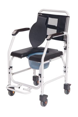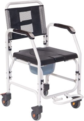 Az Asper fürdőszobai gördíthatő fürdetőszék alumíniumból készült, színe fekete-fehér.Az Asper fürdőszobai fürdetőszék és szoba wc a személyi higiénia hasznos eszköze, akér szoba wc-ként akér zuhany székként is hazsnálható. Vízálló poliuretán (PU) üléssel, stabil karfákkal és lehajtható lábtámasszal rendelkezik.Kerekei fékezhetőek, ami biztonságot és stabilitást kínál.Alkalmas a páciens általi zuhany alatti használatra.