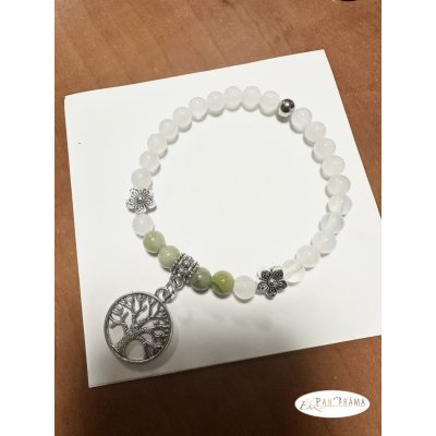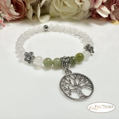 Ásványkő sztreccs karkötő fehér Achat és szerpentin zöld gyöngyökkel, életfa medállal