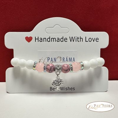 Ásványkő karkötő, kézzel készített Jade - fehér és rózsaszín gyöngyök ezüst fém és strassz díszítéssel és életfa medállal