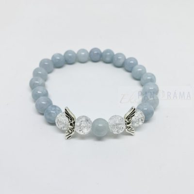 Akvamarin, ásvány gyöngyökből álló szteccs karkötő angyalszárny díszítéssel. Igazán mutatós és úgy vélhető, hogy a szervezetre is jó hatással bír!