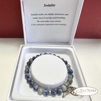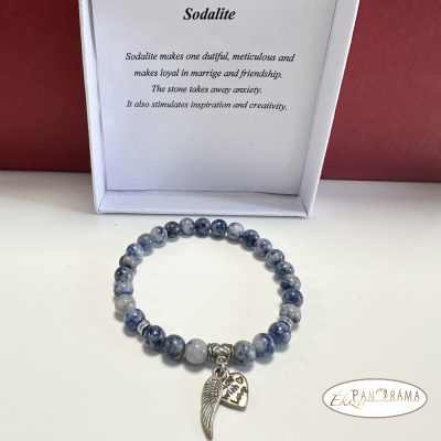 Ásványkő sztreccs karkötő kék sodalite. Szív és angyalszárny medál díszíti!