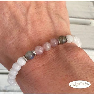 Ásványkő sztreccs karkötő holdkő, labradolit és rózsakvarc gyöngyökkel, ezüst színű betét díszítéssel