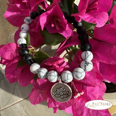 Ásványkő sztreccs karkötő Howlit és ónix kövek, divatos lótusz medállal