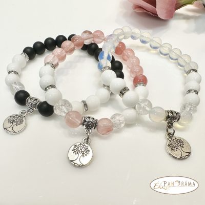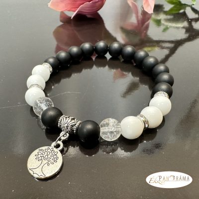 Ásványkő sztreccs karkötő fehér Jade és ónix ásványokkal, életfás ezüst lap medállal.