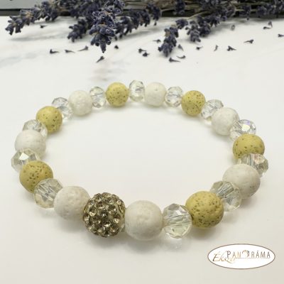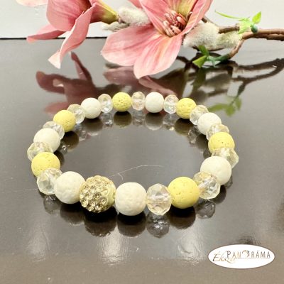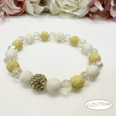 Ásványkő sztreccs karkötő gyönggyel és sárga és fehér fedtett lávakő ásvánnyal.