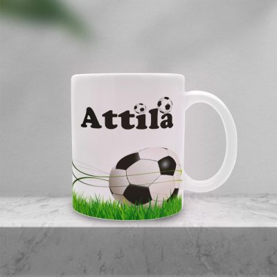 Az elegáns fehér színű bögre elülső részén a választott név büszkélkedik, míg az alsó részen pedig egy futball motívum található. Ez a bögre a mindennapi használatra is alkalmas, és remekül mutat bármilyen konyhaszekrényben vagy irodai asztalon.