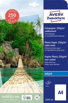 • Avery Zweckform No. 2559-20 tintasugaras nyomtatóval nyomtatható A4-es méretű fehér színű 250 g-os prémium minőségű egyoldalas szatén felületű fotópapír - kiszerelés: 20 lap / csomag (Avery 2559-20)