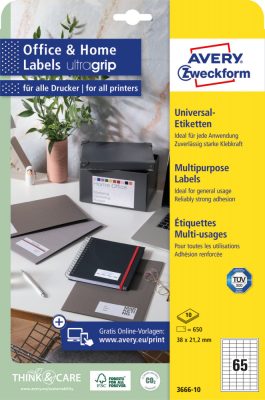 Avery Zweckform No. 3666-10 fehér színű 38 x 21,2 mm méretű, univerzálisan nyomtatható, öntapadós etikett címke, permanens ragasztóval A4-es íven - kiszerelés: 650 címke / 10 ív