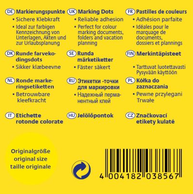 Avery Zweckform 19 mm átmérőjű, sárga színű, matt felületű, jelölő címke (jelölő pötty, jelölő pont) adagoló dobozban, permanens ragasztóval. Rendelési azonosító: Avery Zweckform 3856.