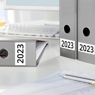 Avery Zweckform 60 x 24 mm méretű, nagy fedőképességű iratrendező címke, előre nyomtatott 2023-as évszámmal és fehér színkóddal, tartós tapadást biztosító ragasztóanyaggal, valamint hegyes sarkokkal. A csomag összesen 100 darab, külön-külön leválasztható, fehér színű, 2023-as évszámmal előre megnyomtatott matricát tartalmaz. Elsősorban széles gerincvastagságú mappák felcímkézésére használható.
