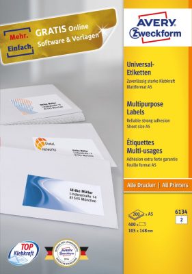 • Avery Zweckform No. 6134 fehér színű 105 x 148 mm méretű, univerzálisan nyomtatható, öntapadós etikett címke, permanens ragasztóval A5-ös íven - kiszerelés: 400 címke / 200 ív