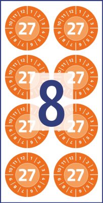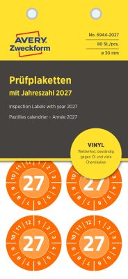 • Avery Zweckform No. 6944-2027 narancssárga színű, 30 mm átmérőjű, öntapadós időjárásálló felülvizsgálati címke, 2027-es évszámmal, 12 hónapos beosztással - kiszerelés: 80 címke / csomag