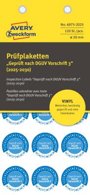 Avery Zweckform No. 6975-2025 kék színű, 20 mm átmérőjű, öntapadós időjárásálló felülvizsgálati címke, 2025-2030-as évszámmal, Geprüft nach DGUV Vorschrift 3 felirattal - kiszerelés: 120 címke / csomag