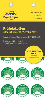 • Avery Zweckform No. 6985-2026 zöld színű, 20 mm átmérőjű, öntapadós biztonsági hitelesítő címke, 2026-2031-es évszámmal, Geprüft gemäß VDE felirattal - kiszerelés: 120 címke / csomag