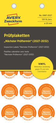 • Avery Zweckform No. 6987-2027 narancssárga színű, 20 mm átmérőjű, öntapadós időjárásálló felülvizsgálati címke, 2027-2032-es évszámmal, Nächster Prüftermin felirattal - kiszerelés: 120 címke / csomag