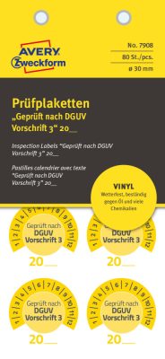• Avery Zweckform No. 7908 sárga színű, 30 mm átmérőjű, öntapadós időjárásálló felülvizsgálati címke, 20__ évszámmal, Geprüft nach DGUV Vorschrift 3 felirattal, 12 hónapos beosztással - kiszerelés: 80 címke / csomag