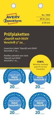 • Avery Zweckform No. 7909 kék színű, 30 mm átmérőjű, öntapadós időjárásálló felülvizsgálati címke, 20__ évszámmal, Geprüft nach DGUV Vorschrift 3 felirattal, 12 hónapos beosztással - kiszerelés: 80 címke / csomag