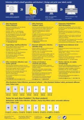 Ultra ellenálló címkékEz a polietilén, időjárásálló öntapadó címke sokkal ellenállóbb a környezeti hatásokkal szemben, mint egy hagyományos papírcímke. Főbb jellemzői: olaj-, szennyeződés-, víz-, UV- és hőálló (-40°C-tól +150°C-ig), továbbá tengervízálló és téphetetlen. Különösen erős tapadás a legkülönfélébb felületeken. Nem öregszik el, ellenáll számos oldószernek és tisztítószernek. Kültéri és beltéri használatra egyaránt alkalmas. Az erős és tartós tapadásnak köszönhetően a felhasználási területei igen szélesek.