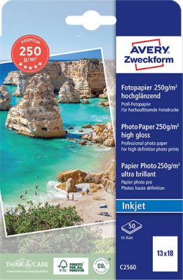 • Avery Zweckform No. C2560 tintasugaras nyomtatóval nyomtatható 13x18 cm-es méretű fehér színű 250 g-os prémium minőségű egyoldalas magasfényű fotópapír - kiszerelés: 50 lap / csomag (Avery C2560)