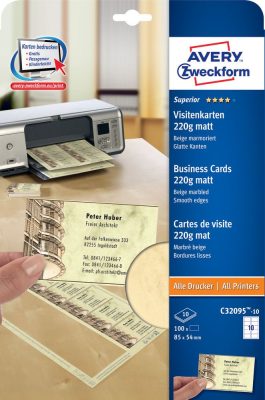 • Avery Zweckform No. C32095-10 univerzális 85 x 54 mm méretű, 220 g-os matt, egyoldalas bézs márványmintás nyomtatható névjegykártya, sima élekkel A4-es íven (Avery C32095-10)